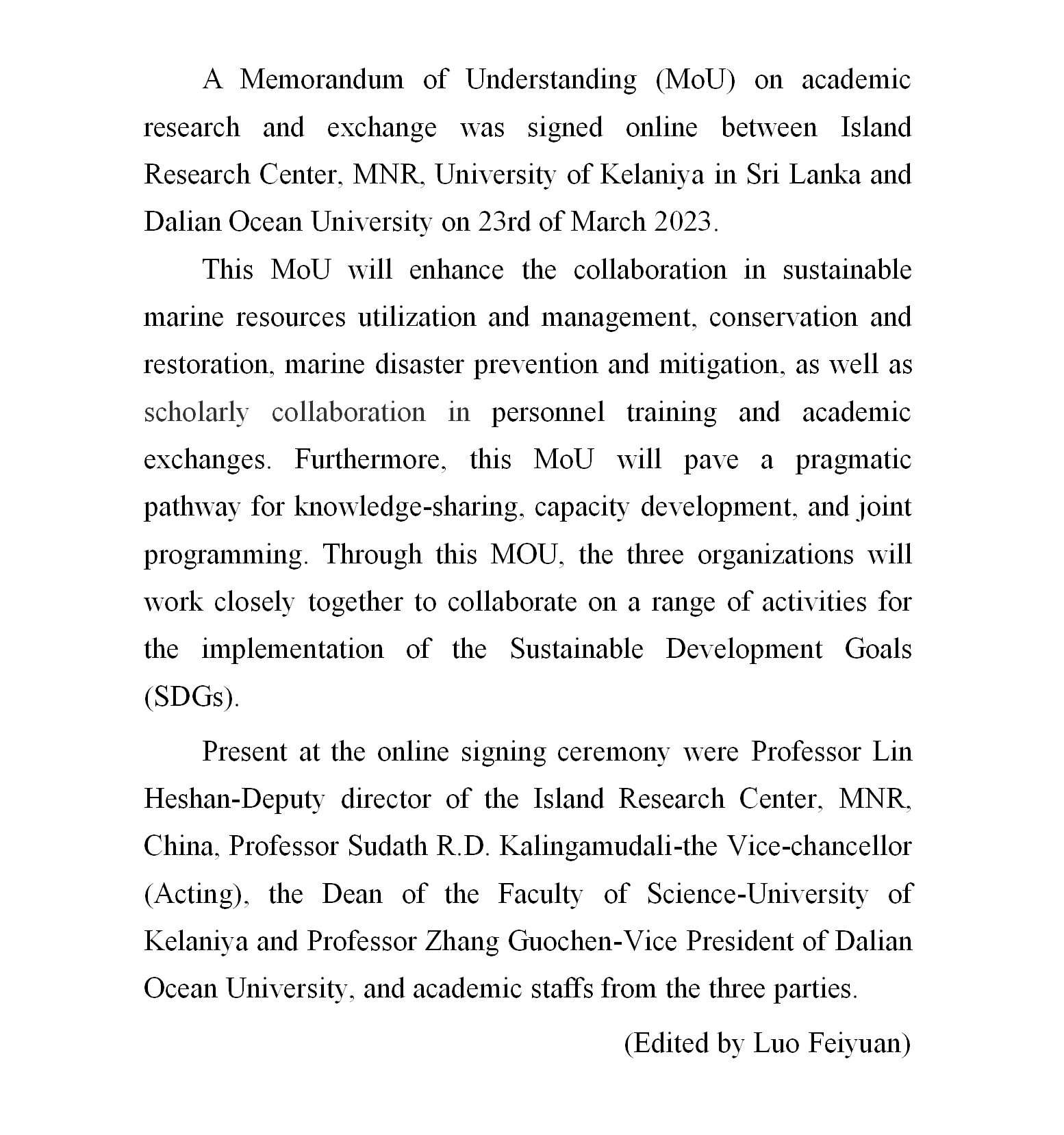 自然資源部海島研究中心與斯里蘭卡凱拉尼亞大學(xué)、大連海洋大學(xué)簽署學(xué)術(shù)研究與交流諒解備忘錄