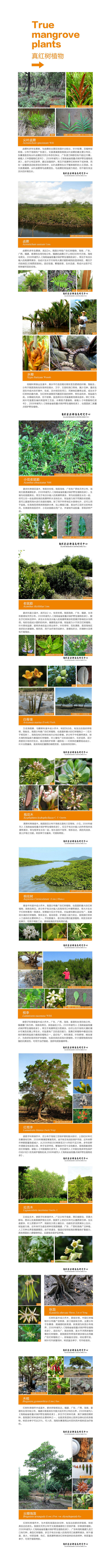 網(wǎng)上關(guān)于紅樹(shù)林的相關(guān)介紹五花八門(mén),也可以查看我們之前的海島植物小課堂第二課(此處有超鏈接)進(jìn)行了解,可能多數人對于秋茄(Kandelia obovata)、白骨壤(Avicennia marina)、桐花樹(shù)(Aegiceras corniculatum)和木欖(Bruguiera gymnorhiza )還相對熟悉,但其他家族成員長(cháng)啥樣,大家還是很陌生的。因此,本期小課堂我們就來(lái)介紹中國現有的紅樹(shù)植物種類(lèi),我國共有野生及引種的紅樹(shù)植物38種,其中真紅樹(shù)植物27種,半紅樹(shù)林植物11種,近幾年將此前視為半紅樹(shù)植物的水芫花(Pemphis acidula)歸到真紅樹(shù)植物的行列中。真紅樹(shù)植物,是指在熱帶或亞熱帶地區的海岸潮間帶灘涂上生長(cháng)的木本植物;半紅樹(shù)植物,是指既能生長(cháng)在海岸潮間帶,有時(shí)可成為優(yōu)勢種,也能在陸地非鹽漬土生長(cháng)的兩棲木本植物。具體如下: