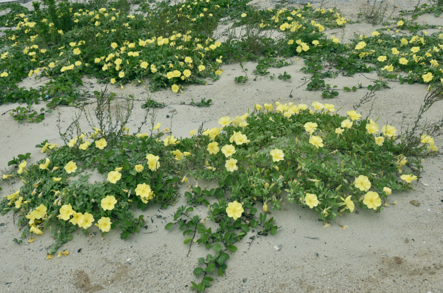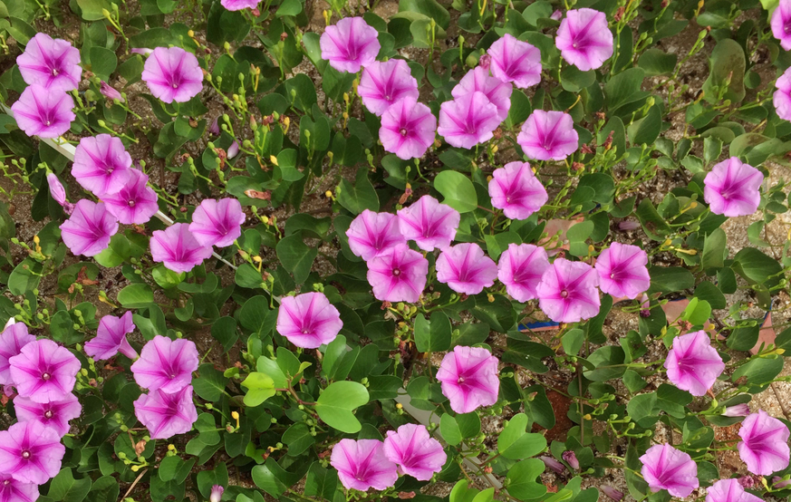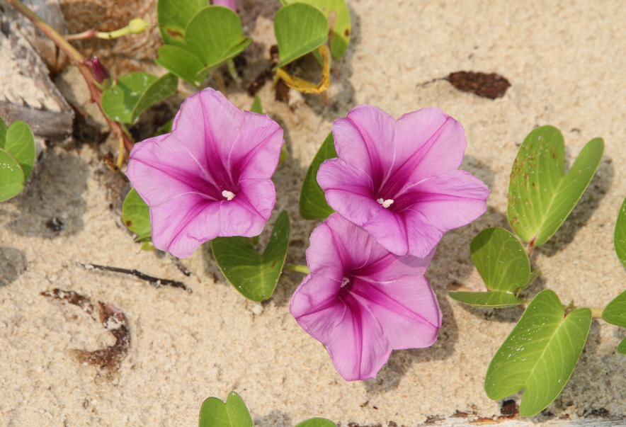 典型的海島海岸帶植物,沙灘上、巖岸縫、珊瑚礁、水岸邊及紅樹(shù)林邊緣經(jīng)常能見(jiàn)到其身影,在沙地上喜歡和海邊月見(jiàn)草(Oenothera drummondii)結伴出行。在海濱地區其他植物無(wú)法生長(cháng)的貧瘠之地,只要有馬鞍藤的種子落地發(fā)芽,就可以期待一片綠意出現,具有抗風(fēng)、耐旱、耐貧瘠、耐沙埋、耐鹽堿等特點(diǎn),是海灘后濱沙地綠化、生態(tài)修復的首席代表。