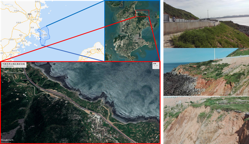 據了解,平潭海岸邊坡常年受海水侵襲,在臺風(fēng)暴雨下極易誘發(fā)滑坡,是我國發(fā)生此類(lèi)災害的高風(fēng)險區域。本項目主要對平潭海岸邊坡開(kāi)展為期一年的坡體崩塌監測預警研究,前期以環(huán)島路院苑山周?chē)?/span>邊坡進(jìn)行試點(diǎn)研究。該處邊坡海拔10~12 m,自然坡角70~95°,面臨長(cháng)江澳,背靠環(huán)島公路,坡體表層為褐、黃褐色粘土夾雜石塊;中層由風(fēng)化花崗巖及土層組成,底層由巖石組成。