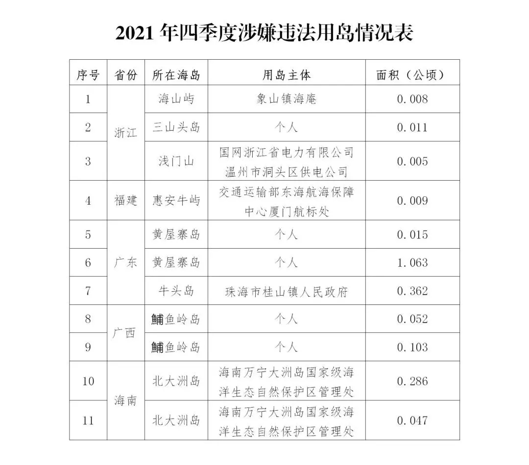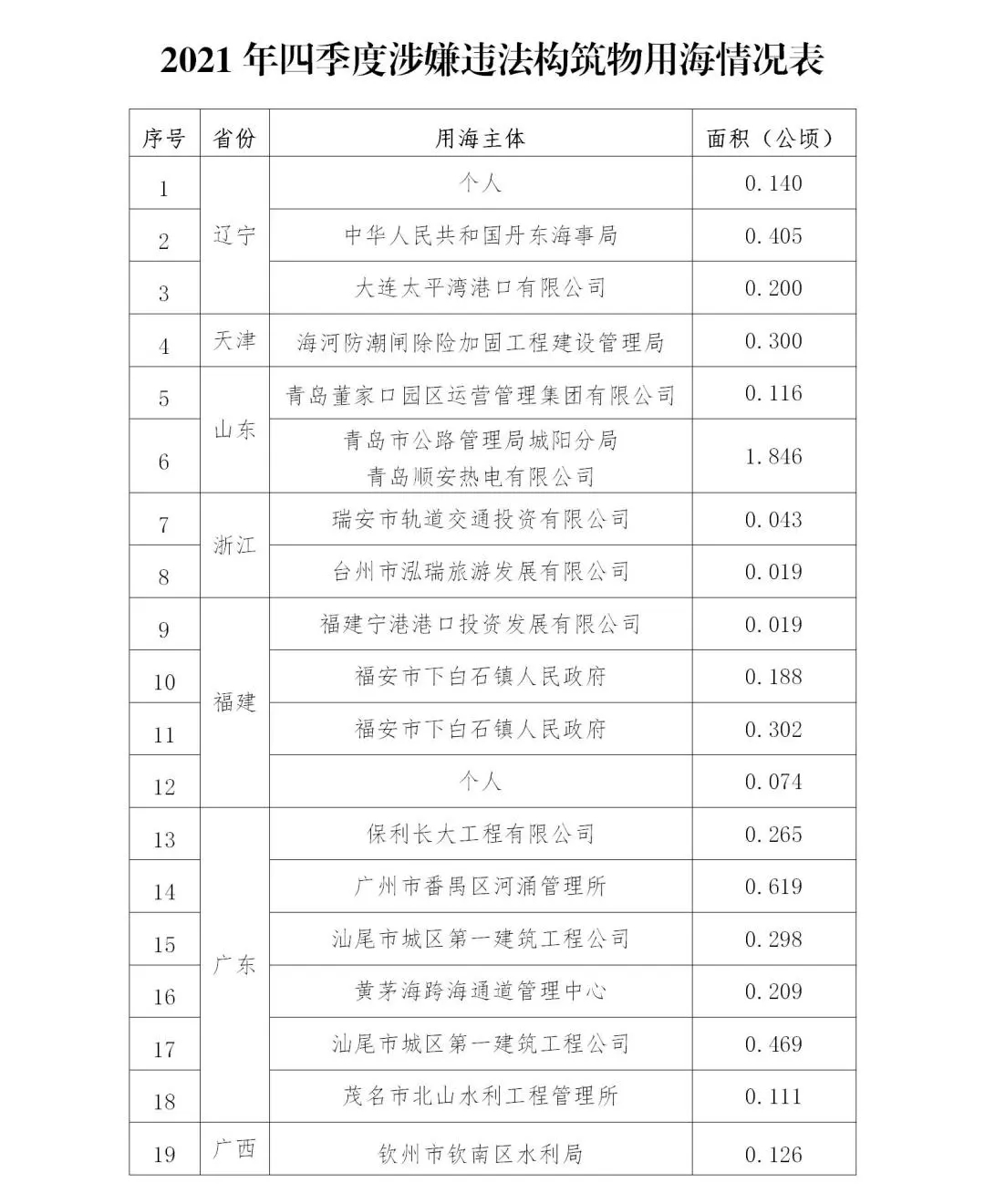 其中,第四季度發(fā)現并制止涉嫌違法填海4處,涉及海域面積約1.83公頃。其中,浙江省1處,涉及海域面積約0.39公頃;福建省1處,涉及海域面積約0.27公頃;廣東省1處,涉及海域面積約0.12公頃;廣西壯族自治區1處,涉及海域面積約1.05公頃。發(fā)現并制止跨海橋梁、碼頭、堤壩等涉嫌違法構筑物用海19處,涉及海域面積約5.75公頃。其中,遼寧省3處,涉及海域面積約0.75公頃;天津市1處,涉及海域面積約0.30公頃;山東省2處,涉及海域面積約1.96公頃;浙江省2處,涉及海域面積約0.06公頃;福建省4處,涉及海域面積約0.58公頃;廣東省6處,涉及海域面積約1.97公頃;廣西壯族自治區1處,涉及海域面積約0.13公頃。發(fā)現并制止涉嫌違法用島11處,面積約1.96公頃。其中,浙江省3處,面積約0.02公頃;福建省1處,面積約0.01公頃;廣東省3處,面積約1.44公頃;廣西壯族自治區2處,面積約0.16公頃;海南省2處,面積約0.33公頃。(清單附后)